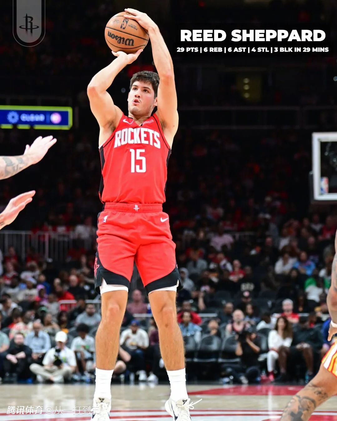 同一天,2024年的探花秀里德-谢泼德大爆发,全场轰下29分、6篮板、6助攻、4抢断、3封盖,带领轮休了多位主力的火箭击败老鹰主力。