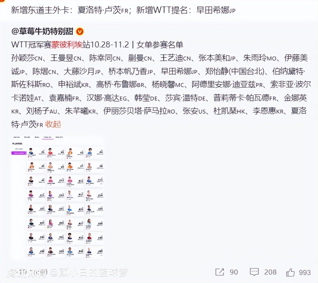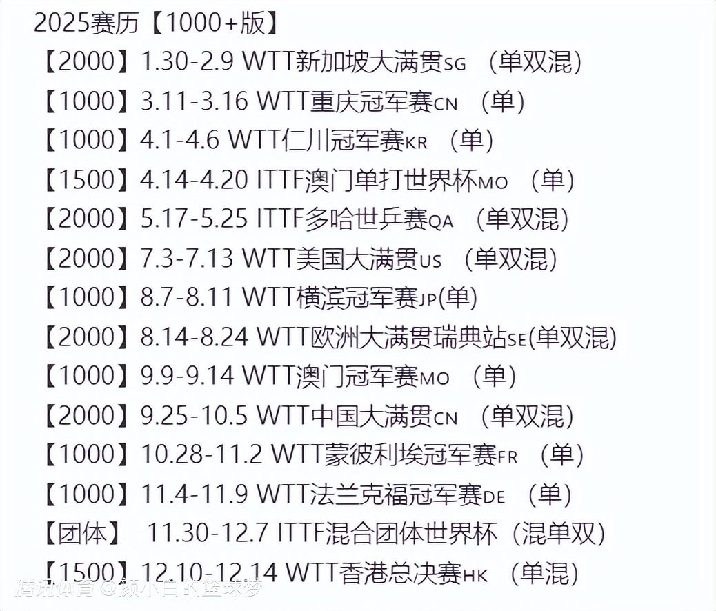 不过孙颖莎在打全运会之前,她还有一站赛事要打,那就是2025年蒙彼利埃冠军赛(10月28日-11月2日),这也是WTT1000+赛事,中国队:孙颖莎、王曼昱、陈幸同、蒯曼、王艺迪、陈熠等人都会参与,换言之打完亚锦赛回国休息几天就要飞往法国备战蒙彼利埃冠军赛。