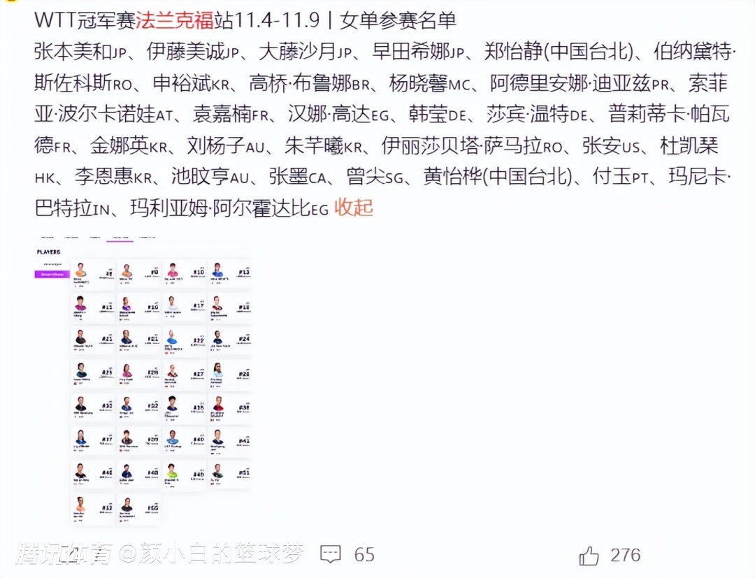 蒙彼利埃冠军赛结束后,德国站冠军赛又要打响,11月4日-11月9日在法兰克福又有一场WTT1000+赛事,但这次国乒没有任何一人参与,因为这个时间刚好跟全运会撞项了,国乒选手肯定要为自己的省份争荣誉。