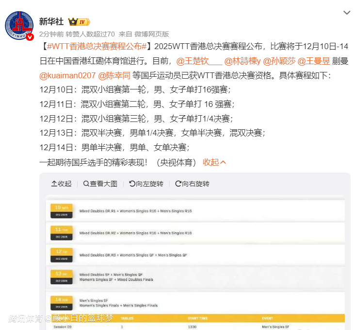 因为12月10日WTT香港总决赛也要开打了,国乒的核心选手们不是在比赛就是在比赛的路上、训练馆、去训练馆的路上,所以很多运动员脸上都写着巨大的疲惫两个字。