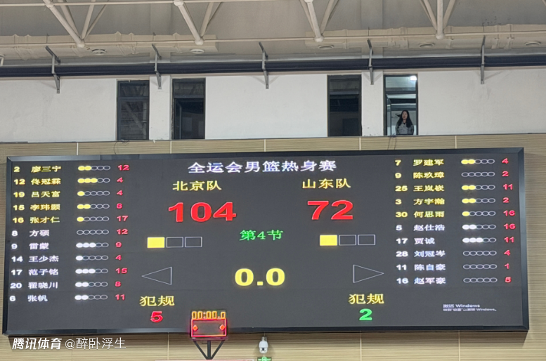 北京男篮仅仅两节比赛就打崩山东男篮,下半场比赛彻底沦为垃圾时间,双方开启练兵模式,北京男篮后两节有所放水,从而下半场48-52被追回4分,最终北京男篮104-72大胜山东男篮。