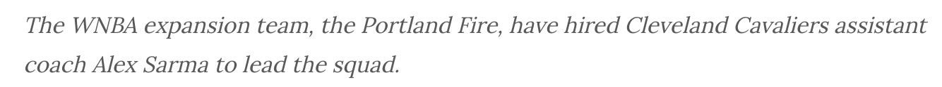 骑士助教升职!WNBA扩军队伍波特兰火焰聘请萨马拉成为球队主帅