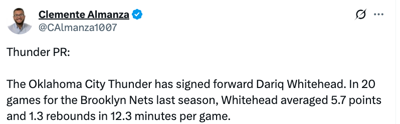 此前刚被篮网裁掉!雷霆官方宣布签下怀特黑德