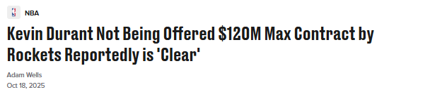 2025-10-18 06:00北京时间10月18日,凯文-杜兰特即将开启加盟火箭队的首个赛季,同时这也是他当前合同的最后一年,但目前他似乎无法获得一份顶薪续约合同。