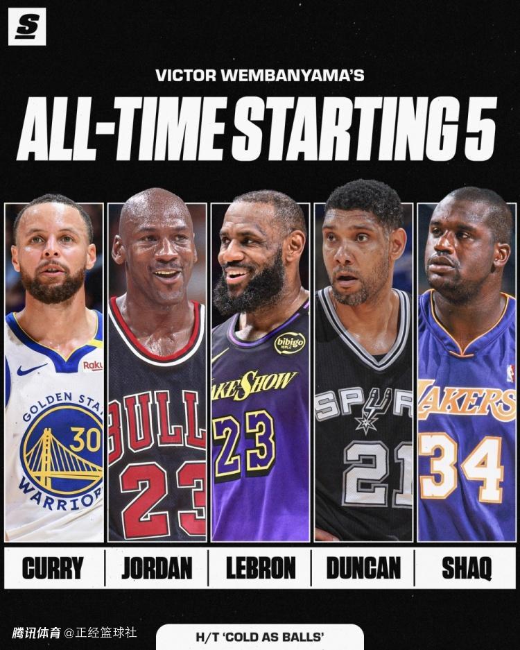 在被问到心中最强阵容的时候,文班亚马给出的五个人分别是:乔丹、詹姆斯、库里、奥尼尔、邓肯。