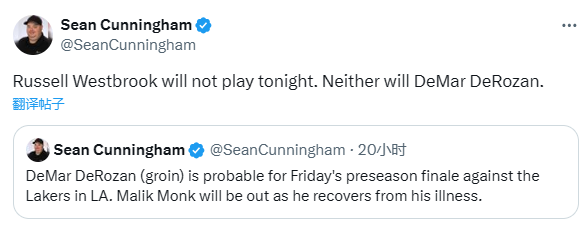 2025-10-18 07:20北京时间10月18日,NBA季前赛继续进行,国王对阵湖人。赛前,据国王队记Sean Cunningham报道,球队阵中马利克-蒙克和德罗赞(腹股沟)因伤将缺席本场比赛,国王新援威少也不会出战。