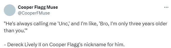 “他真的很棒,看得出来他很喜欢达拉斯,他的家人也特别好。我们也在努力让他有宾至如归的感觉。他很会讲那种能让人反复回味的笑话,不管是谁听了,都会笑着说行啦行啦,小老弟。不过我们都没太当回事儿。”