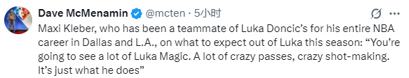 克勒贝尔说道:“我和他搭档很久了,这段时光特别有意思。你们会看到很多卢卡的神奇时刻,各种不可思议的传球、匪夷所思的投篮,这就是他的常规操作。作为队友,你得时刻做好准备,因为他随时可能把球传到你手上。”