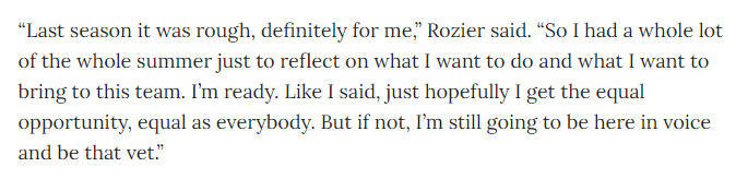 “上赛季太艰难了,对我来说尤其如此,”罗齐尔表示,“所以整个夏天我都在反思,思考自己想做什么、能为这支球队带来什么。现在我已经准备好了。就像我说的,只希望能得到平等的机会,和其他人一样的机会。但即便事与愿违,我也依然会留在队中发声,履行老将的职责。”