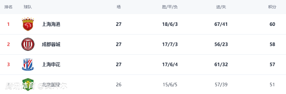 27轮之后,上海海港以60分继续领跑,成都蓉城以58分排名第二位,而申花则以57分排名第三位。