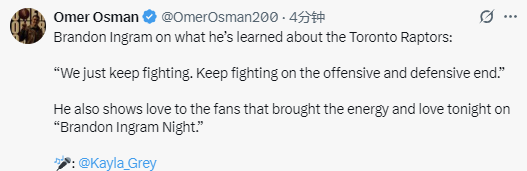 英格拉姆:猛龙的特质就是不断拼搏 很感谢球迷给予的能量和爱