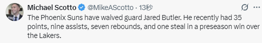 贾里德-巴特勒在不久前的一场季前赛中率队击败湖人队,当时他砍下35分、9次助攻、7个篮板和1次抢断,但出色的表现依然未能帮助他留队。
