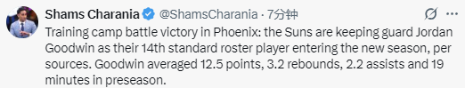 此前,乔丹-古德温和贾里德-巴特勒在竞争一个留队名额。Shams写道:“据消息人士透露,在菲尼克斯太阳队的训练营竞争中,后卫乔丹-古德温成功留队,新赛季他将成为球队常规阵容中的第14位球员。季前赛期间,古德温场均登场19分钟,能得到12.5分、3.2个篮板和2.2次助攻。”