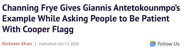 弗莱并非将弗拉格与字母哥相提并论,而是想说明,凭借基德的指导,两人或许能拥有相似的职业生涯发展轨迹。弗拉格目前年仅18岁,有充足的时间成长为一名出色的球员。作为参考,字母哥当年是在22岁时才成功入选全明星,实现职业生涯的关键突破。