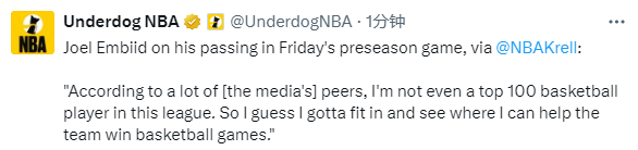 此外,恩比德还在采访中提到,“根据很多媒体同行的说法,我甚至都算不上联盟前100的篮球运动员了。所以我想,我现在要做的就是做好自己的角色,看看能在哪些方面帮球队赢球。”