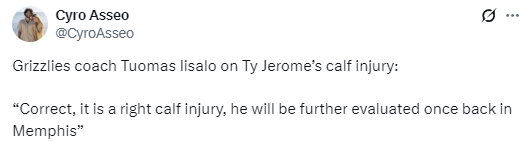 在谈到杰罗姆的小腿伤势时,伊萨洛表示:“情况属实,他确实是右小腿受伤,回到孟菲斯后将接受进一步检查评估。”