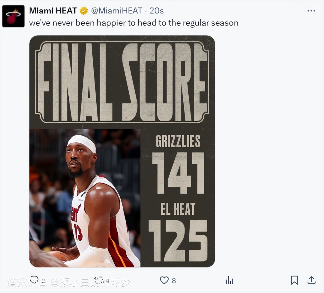 2025-10-18 11:30北京时间10月18日,NBA季前赛,热火125-141惨败灰熊。这场比赛热火是被逆转的,前三节打完热火都领先灰熊,但末节两队第三阵容的比拼灰熊一波39-22打崩热火,最终灰熊在客场拿到胜利。