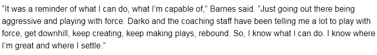 巴恩斯爆砍31分:这场比赛提醒了我自己能做什么 保持侵略性坚决突破内线