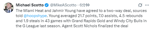 2025-10-18 12:30北京时间10月18日,记者Michael Scotto报道,据消息人士向HoopsHype透露,热火队已与贾米尔-杨达成一份双向合同协议。其经纪人斯科特-尼科尔斯已完成合同最终敲定。