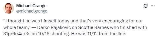 在谈到巴恩斯的表现时,拉亚科维奇表示:“我特别欣赏斯科蒂-巴恩斯在攻防两端展现出的冲击力:他多次完成抢断、制造防守干扰,还能在转换进攻中加快节奏,他绝对是我们上半场的‘能量助推器’,有他在,我们未来能打出更多可能性。另外,巴恩斯在篮下的冲击力尤其值得一提,今晚他的得分,几乎都来自禁区或者罚球线,靠着强势突破内线得分。”