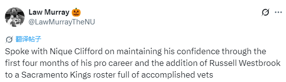 关于威斯布鲁克加盟国王队后感受,克利福德表示:“真的很棒。威斯布鲁克已经在某种程度上改变了球队文化,也稍微调整了球队的氛围。今天他一来,带来的那种氛围,特别好的氛围,你能明显感觉到。他确实带来了很多活力,能有他在队里真的很特别。”