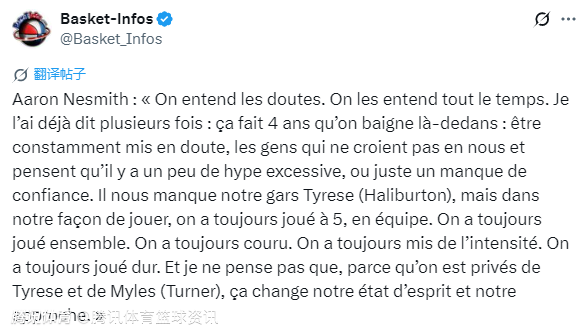 内史密斯表示:“我们能听到那些质疑声,而且一直都能听到。我已经说过很多次了,过去4年,我们一直身处这样的环境中,不断被质疑,有人不相信我们,觉得我们身上有太多炒作成分,或者就是觉得我们缺乏信心。我们确实失去了哈利伯顿这样的核心球员,但从我们的打法来看,我们一直都是5个人并肩作战,始终秉持团队篮球的理念。”