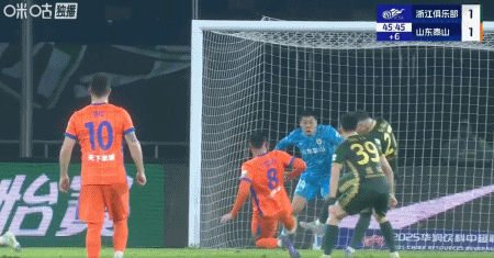 上半场补时第1分钟,浙江队左路传中,山东泰山后卫同样出现失误,亚戈门前近距离扫射得手,浙江队闪电扳平,1-1。