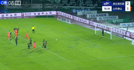 第52分钟,山东泰山将前场任意球送入禁区,刘洋插上近距离头球冲顶,被赵博神奇扑出。