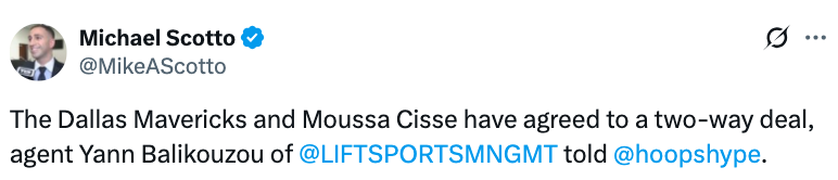 2025-10-19 00:50北京时间10月19日,据名记Scotto报道,独行侠和穆萨-西塞签下了一份双向合同。此前独行侠和他签下了一份EX10合同。