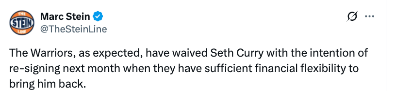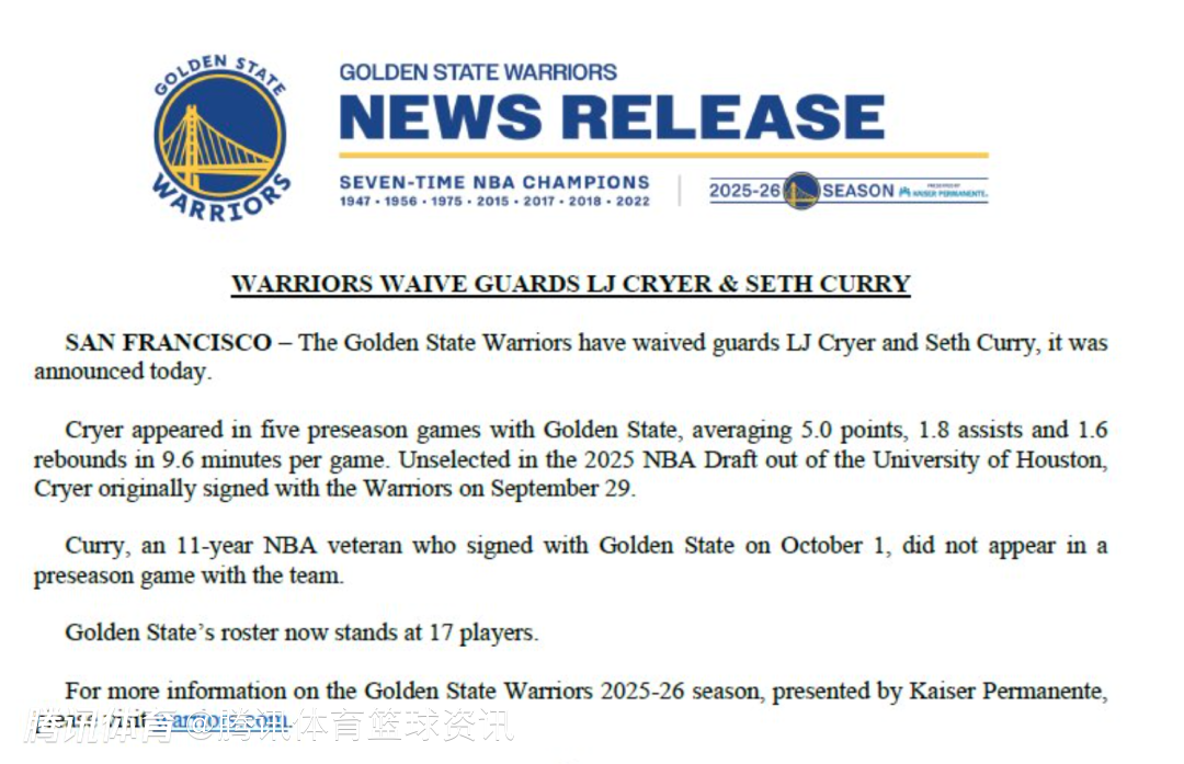 2025-10-19 01:00北京时间10月19日,勇士官方宣布,球队已经正式裁掉了LJ-克莱尔和塞斯-库里。不过名记Stein跟进报道,勇士计划在下个月当球队具备足够的财务灵活性时重新签下他。