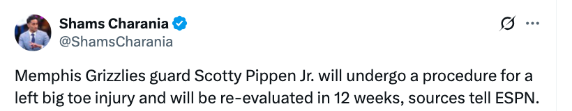 2025-10-19 01:50北京时间10月19日,据名记Shams报道,小皮蓬接受左脚大脚趾手术,12周后重新评估。随后灰熊官方也发布公告证实了这一消息,但并未透露具体的恢复时间表。