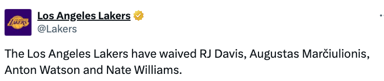 湖人官方:球队已经裁掉RJ-戴维斯、沃特森等四人