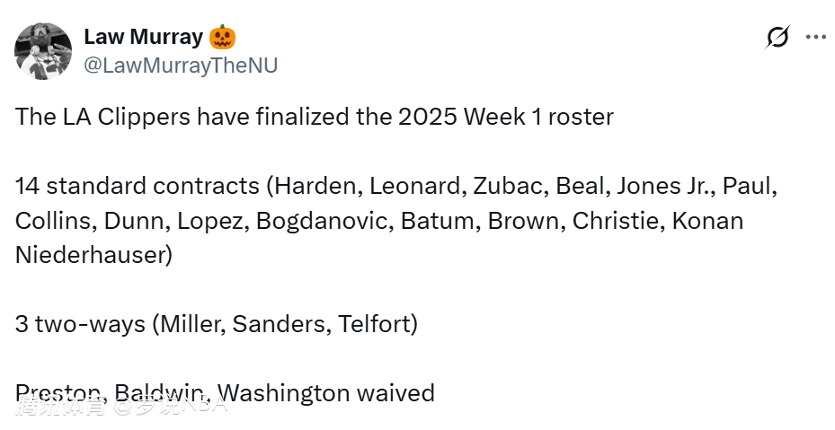 快船队目前的薪资非常接近硬工资帽,无法以满额阵容开启新赛季。在上述操作完成后,快船队将拥有14份标准合同和3份双向合同。