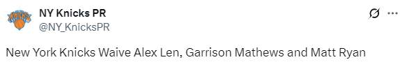 尼克斯官宣连裁三人:加里森-马修斯领衔 前湖人球员莱恩在列
