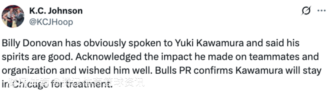 2025-10-19 11:10北京时间10月19日,近期,公牛官方宣布裁掉双向合同球员河村勇辉。据公牛队记KC-约翰逊报道,球队主帅多诺万和河村勇辉进行了沟通,他目前精神状态良好,多诺万肯定了河村勇辉对队友和球队的积极影响,并且祝他一切顺利,接下来,河村勇辉将会继续留在芝加哥,接受小腿伤势治疗(被裁是因为健康原因)。