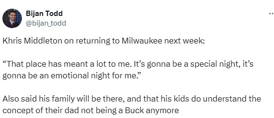 米德尔顿表示:“那个地方对我意义重大。那会是一个特别的夜晚,对我来说也将是充满情绪的一晚。”他还提到,家人届时会到场支持,而且孩子们已经明白,他们的爸爸不再是雄鹿队球员了。