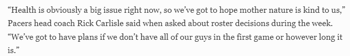 卡莱尔表示:“健康显然是目前的一大关键问题,所以我们只能期望老天爷能眷顾我们。如果首场比赛,或者在接下来某段时间里,我们无法让所有球员都登场,我们必须要有应对预案。”