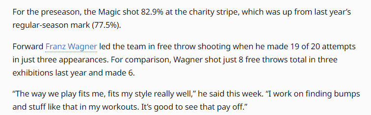 季前赛期间,魔术队的罚球命中率达到82.9%,高于上赛季常规赛的77.5%。小瓦格纳以极高的罚球命中率领跑全队,他仅出战3场季前赛,20次罚球尝试命中19次。相比之下,小瓦格纳上赛季季前赛同样出战3场,总共仅获得8次罚球机会,仅命中6次。
