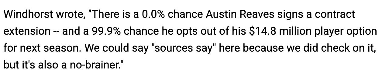 文胖表示:“里夫斯签下提前续约合同的概率为0%,而他选择跳出下赛季(26-27赛季)1480万的球员选项的概率则高达99.9%。”