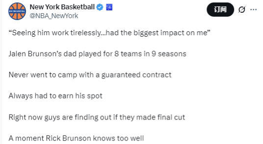 杰伦-布伦森说道:“我父亲打了9个赛季,效力过8支球队,但每年都没有保障性合同。所以小时候,我总看到他拼尽全力训练:练力量、投篮,从早到晚都在练,整个夏天也不停歇。那时候我还不明白,为什么他每天都要这样。等我长大一些才意识到,我想以篮球为业,而我的目标正是源于看着父亲训练的样子。
