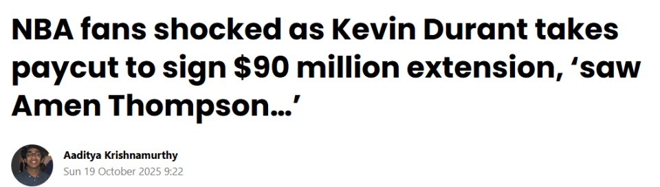 在杜兰特接受了比他有资格获得的1.2亿美元顶薪少3000万美元的消息传出后,一些球迷称赞这位超级巨星具有团队精神。