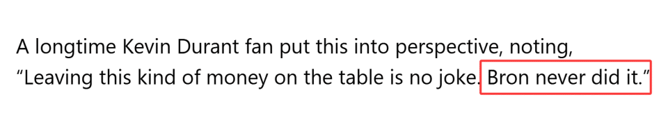 一位长期支持杜兰特的球迷对此进行了客观的评价,他指出:“放弃这么多钱可不是闹着玩的。勒布朗可从来没有这样做过。”