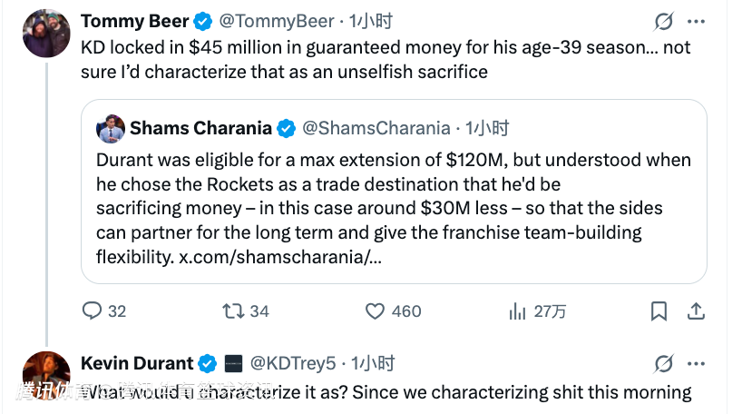 有网友转发了Shams的报道,并且配文写道:“杜兰特在自己39岁拿到了4500万美元的保障薪资,我不确定这能被称作是无私的牺牲。”随后杜兰特第一时间回复道:“那你觉得这该被称作什么?既然今天早上大家都在给事情(续约)定性。”