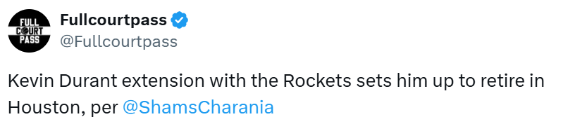 Shams表示:“杜兰特已与休斯顿火箭队达成一份为期两年、价值9000万美元的续约协议。这样一来,他在火箭队的合同总时长变为三年,总金额约1.45亿美元。他的商业伙伴里奇-克莱曼告诉我,这份合同中还包含2027-28赛季的球员选项,不过这一安排也让杜兰特有望在休斯顿结束职业生涯。”