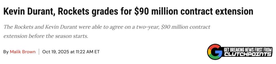 2025-10-20 01:10北京时间10月20日,杜兰特和火箭达成2年9000万美元的续约合同,比顶薪少拿3000万。知名美媒ClutchPoints对续约双方进行了评级。杜兰特现在多了两年的稳定合同,而火箭则锁定了这位有史以来最出色的得分手之一,希望他能帮助球队突破瓶颈,在季后赛中走得更远。以下是续约后对杜兰特和火箭的评级——