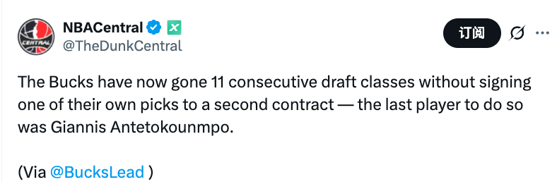 选秀培养困局?雄鹿连续11届自家新秀未获续约 仅字母哥打破魔咒