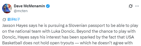 在被问及是否正在办理斯洛文尼亚护照,未来计划与东契奇并肩征战国际赛场时,海斯给出了肯定答复:“是的,不过具体细节我目前不太清楚。我和东契奇拥有同一位经纪人,现阶段我们双方的家人正在积极推动这件事。”
