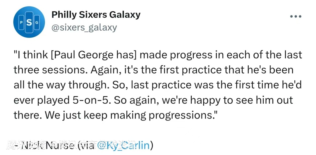 纳斯补充评价乔治时说道:“他状态不错,移动很灵活。他还需要加强一些体能训练之类的,但整体看起来很好。他确实在努力让自己恢复状态。防守端的表现尤其出色,移动积极,而且他很擅长判断场上局势,能利用身高优势及时回防、完成封堵,也能妥善处理外线防守的情况,很清楚自己在防守端该做什么。他正在不断进步。”