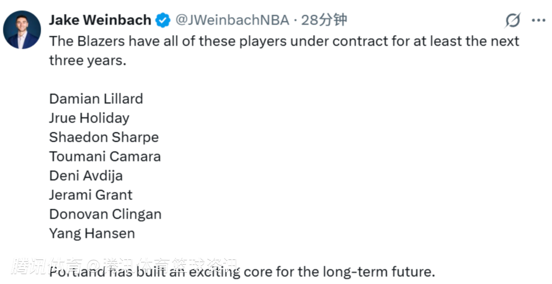 这些球员包括:利拉德、朱-霍勒迪、夏普、卡马拉、阿夫迪亚、杰拉米-格兰特、克林根、杨瀚森。随后该记者也写道:“开拓者已经为球队的长远未来打造了一套令人兴奋的核心阵容。”