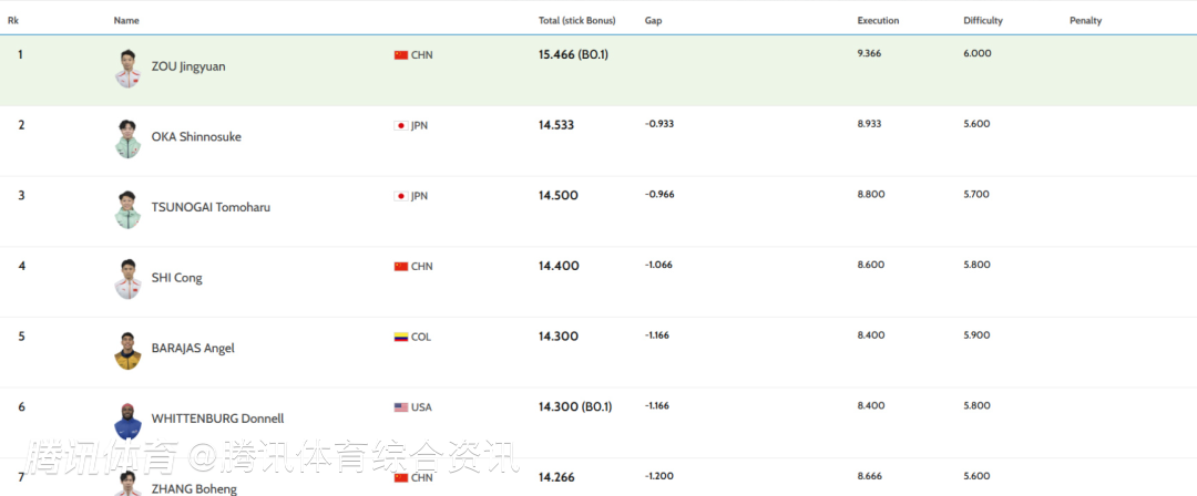 邹敬园在难度分(D分)获得6.0,完成分(E分)获得9.366,加分(动作衔接或难度认可)0.1,最终获得了15.466的总得分,资格赛全场第一。